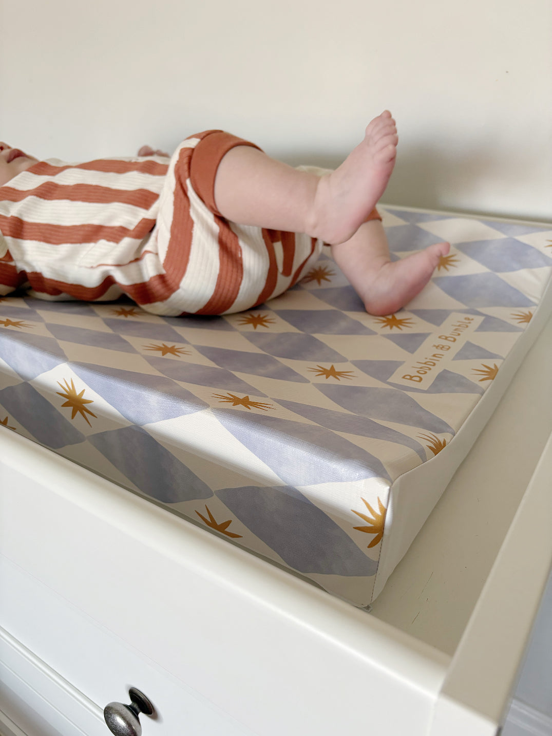 Our Blue Harlequin Wedge Changing Mat features a timeless diamond checkered design in soft shades of blue, bringing a bold yet versatile look to your baby’s changing space. Whether you’re going for a circus-inspired nursery or simply love a clean, graphic pattern, this exclusive Bobbin and Bumble design adds a touch of charm and sophistication to your setup.