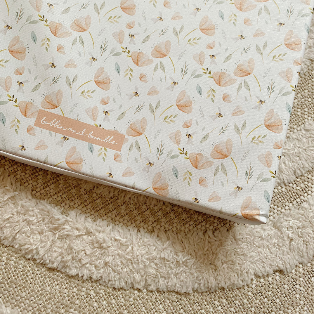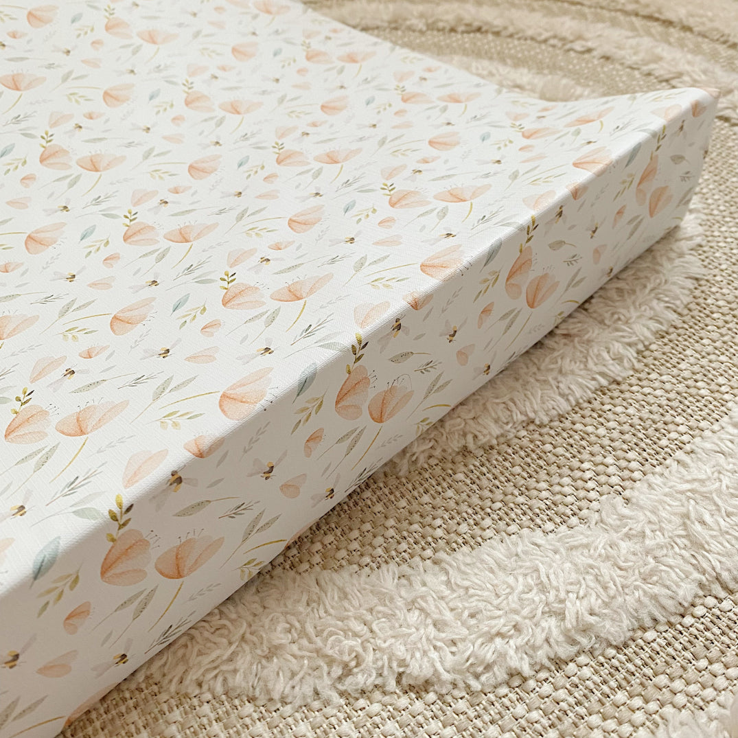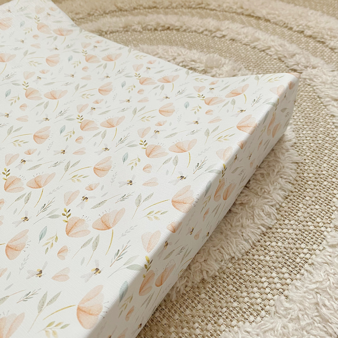 Add a touch of beauty to your changing routine with our hand-painted bee garden wedge changing mat. The delicate floral print has dainty peach flowers and bees transforming a normally bland item into a beautiful focal point in your nursery.
