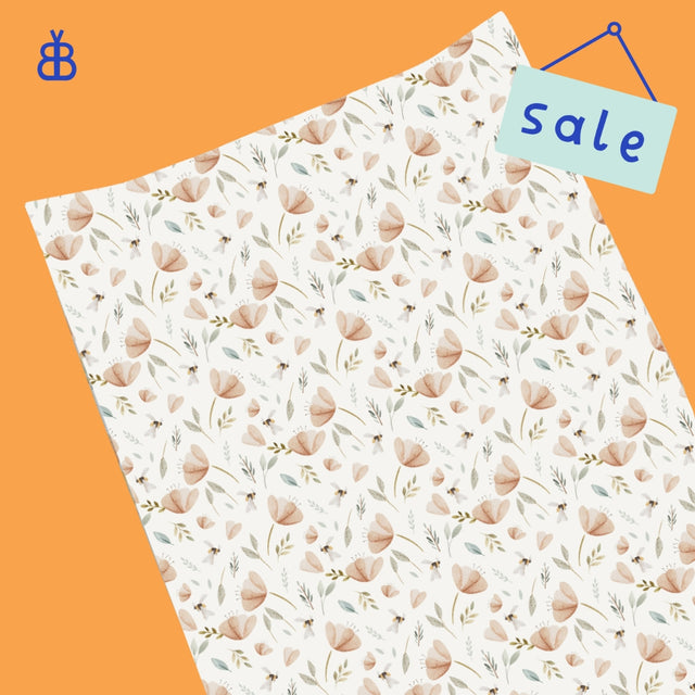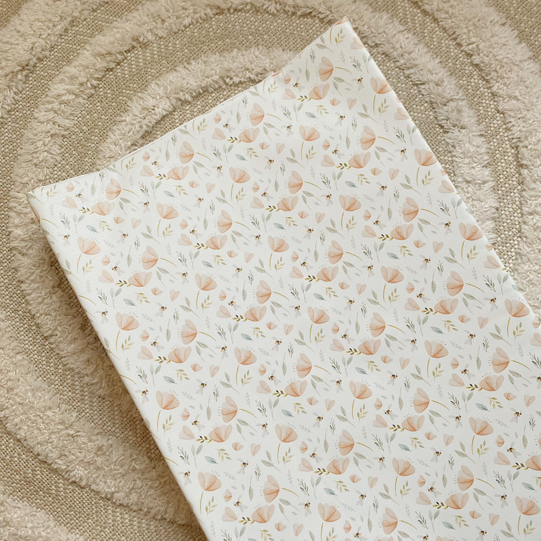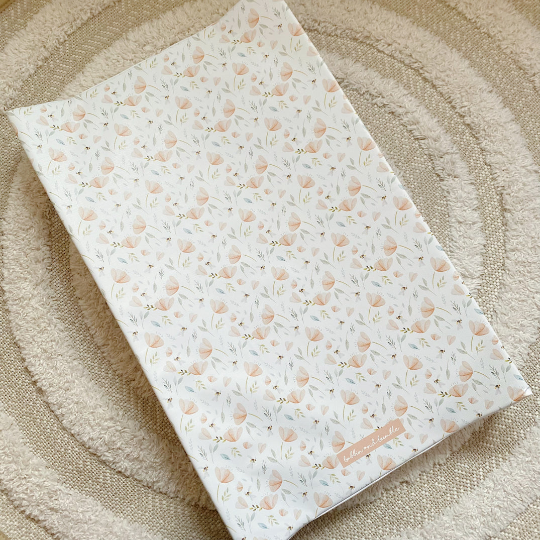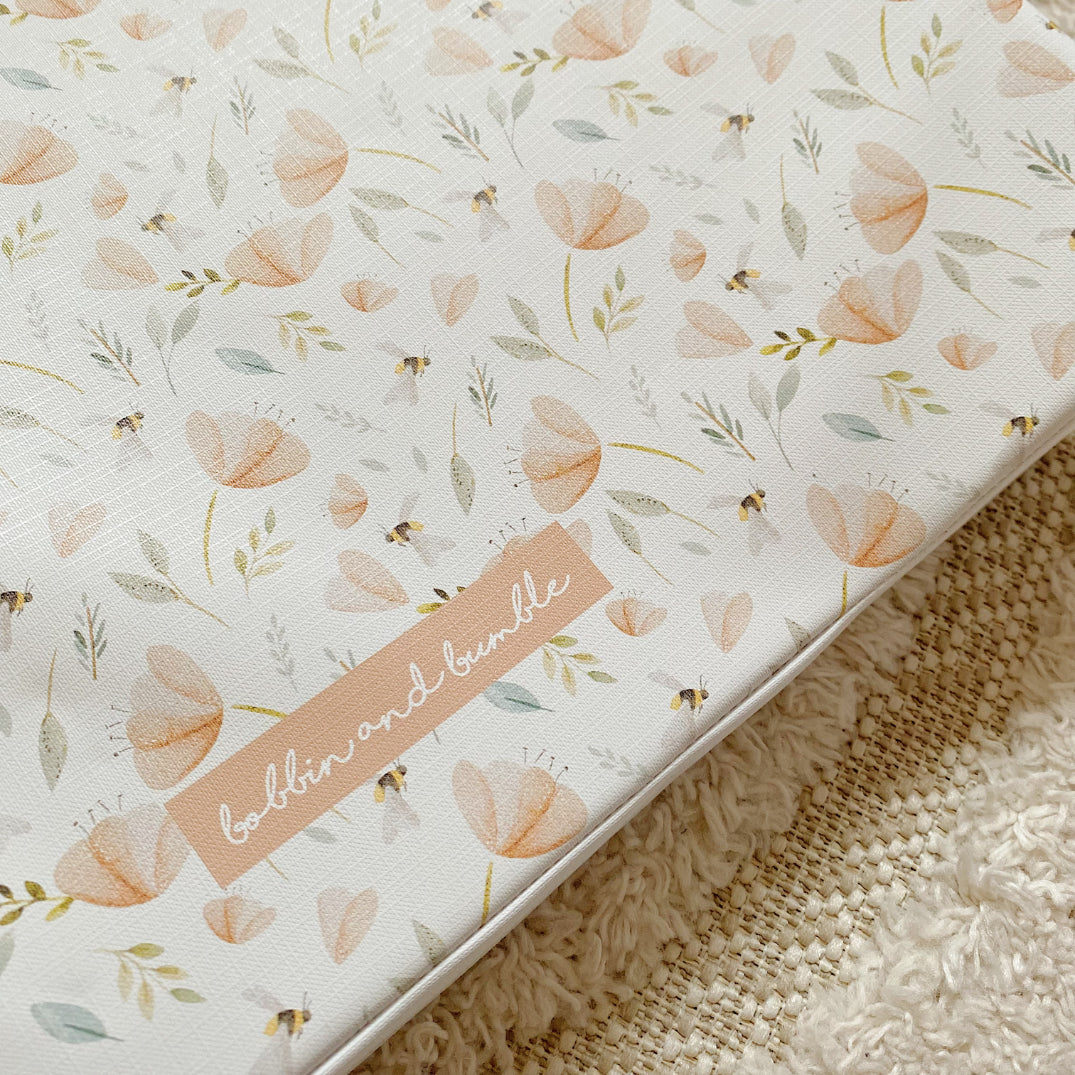 Add a touch of beauty to your changing routine with our hand-painted bee garden wedge changing mat. The delicate floral print has dainty peach flowers and bees transforming a normally bland item into a beautiful focal point in your nursery.