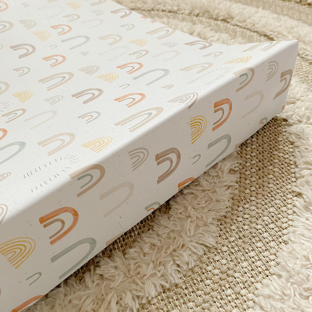 Our abstract rainbow print is made up of soft muted unisex colours such as brown, orange, green and yellow. You can say goodbye to boring unisex prints as this vibrant rainbow pattern would be perfect in a boy or girl's nursery. The varied colours used to make up the rainbows mean this changing mat would fit in with lots of nursery colour schemes.