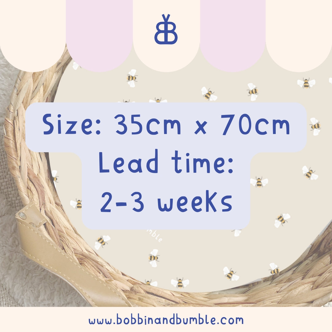Bees PVC Changing Basket Liner | Bobbin and Bumble - 30cm x 70cm (Fits Olli Ella Nyla) is backordered and will ship as soon as it is back in stock.