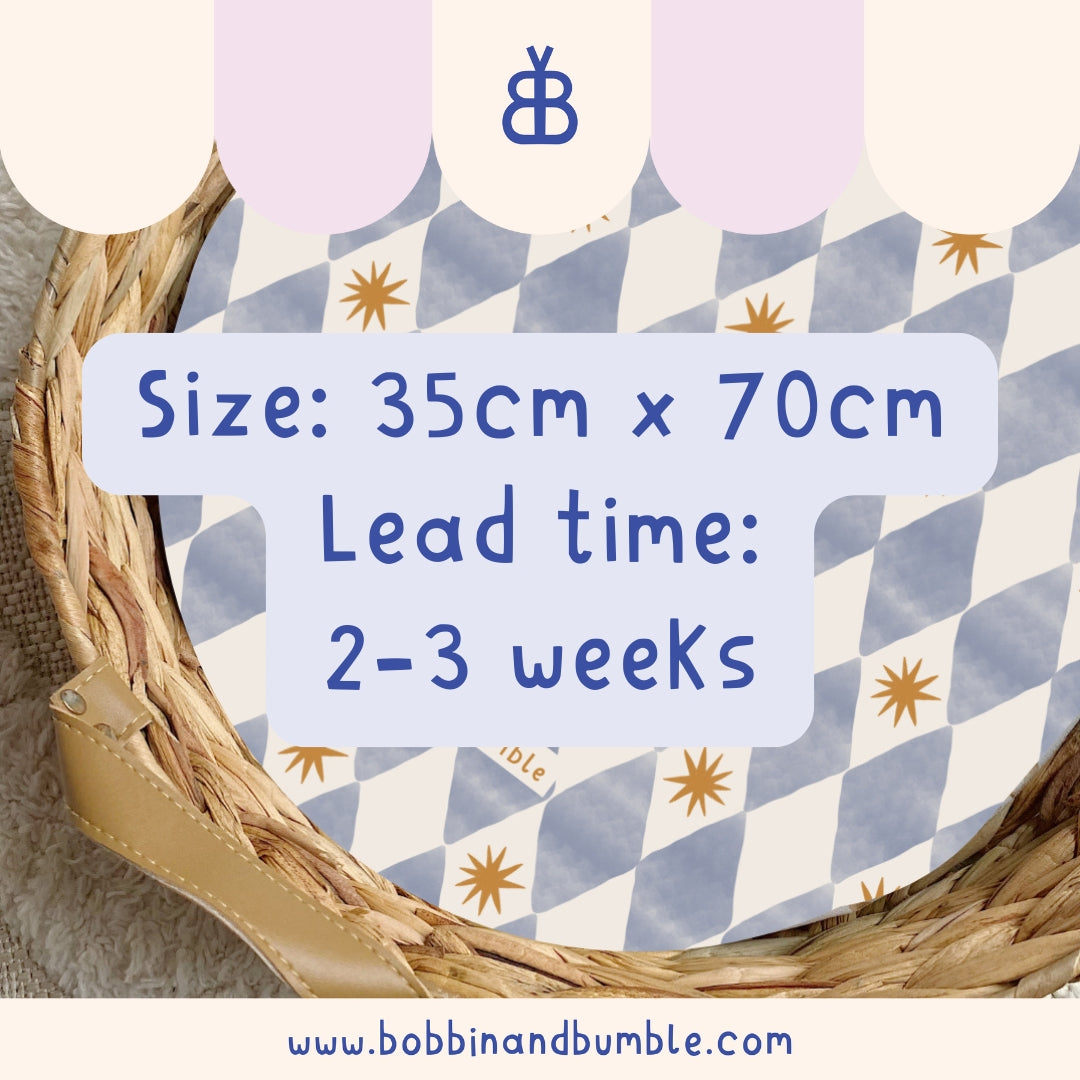 Bring style and practicality to your nursery with our Custom PVC Baby Changing Basket Liner featuring a Blue Harlequin Diamond Print with Mustard Stars. Designed exclusively for Bobbin and Bumble, this beautiful liner combines a classic blue harlequin diamond pattern with playful mustard stars, adding a charming touch to your changing station.