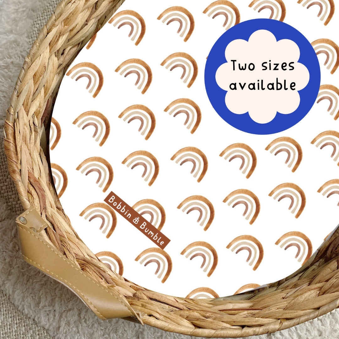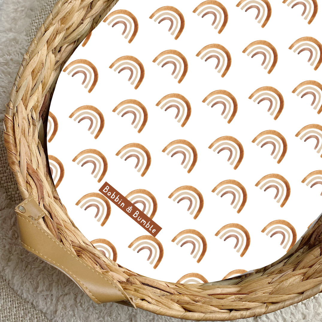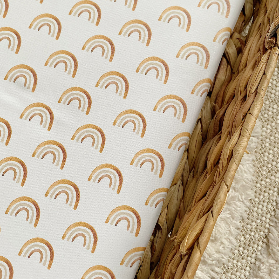 Brighten up your baby’s changing space with our Boho Rainbows PVC Changing Basket Liner. This cheerful rainbow-designed changing basket liner has a white background with neutral earth-toned rainbows which have been painted in watercolour. A perfect unisex rainbow baby print.