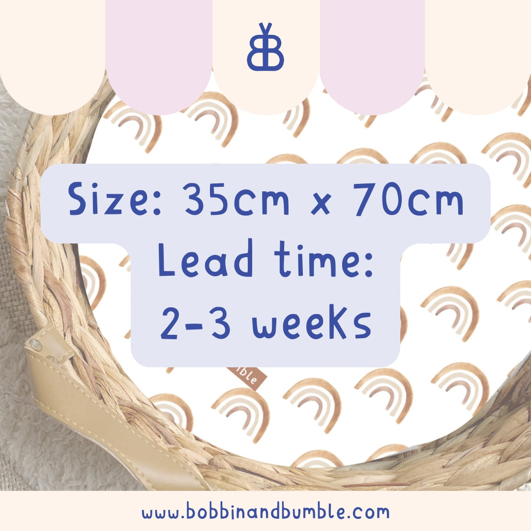 All of our changing basket liners are made to order and generally dispatched within 2 weeks via Evri. Please see our Shipping Page for the most up-to-date information.