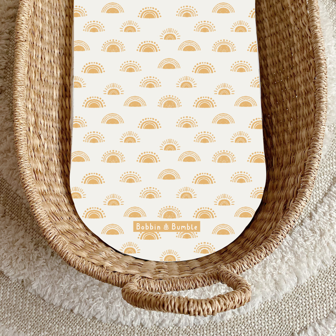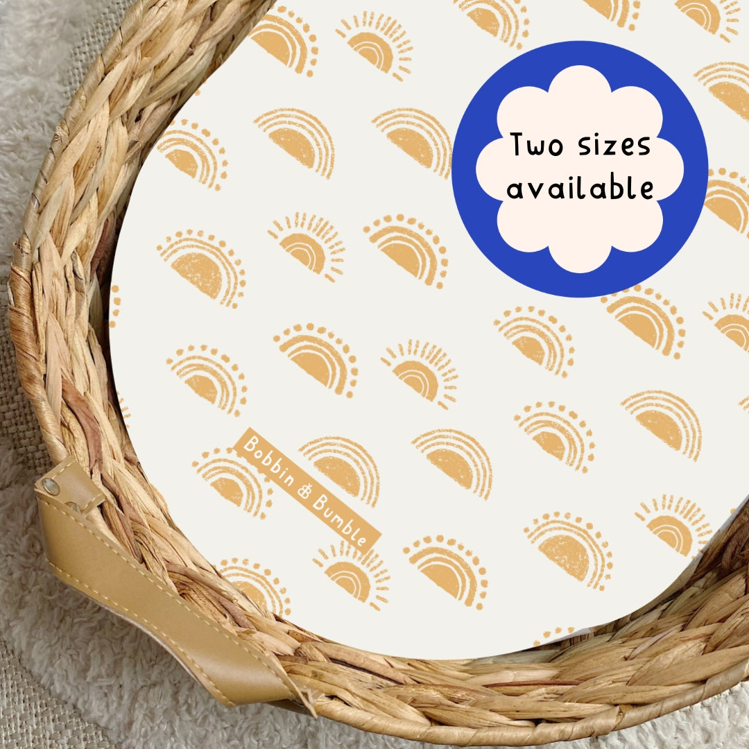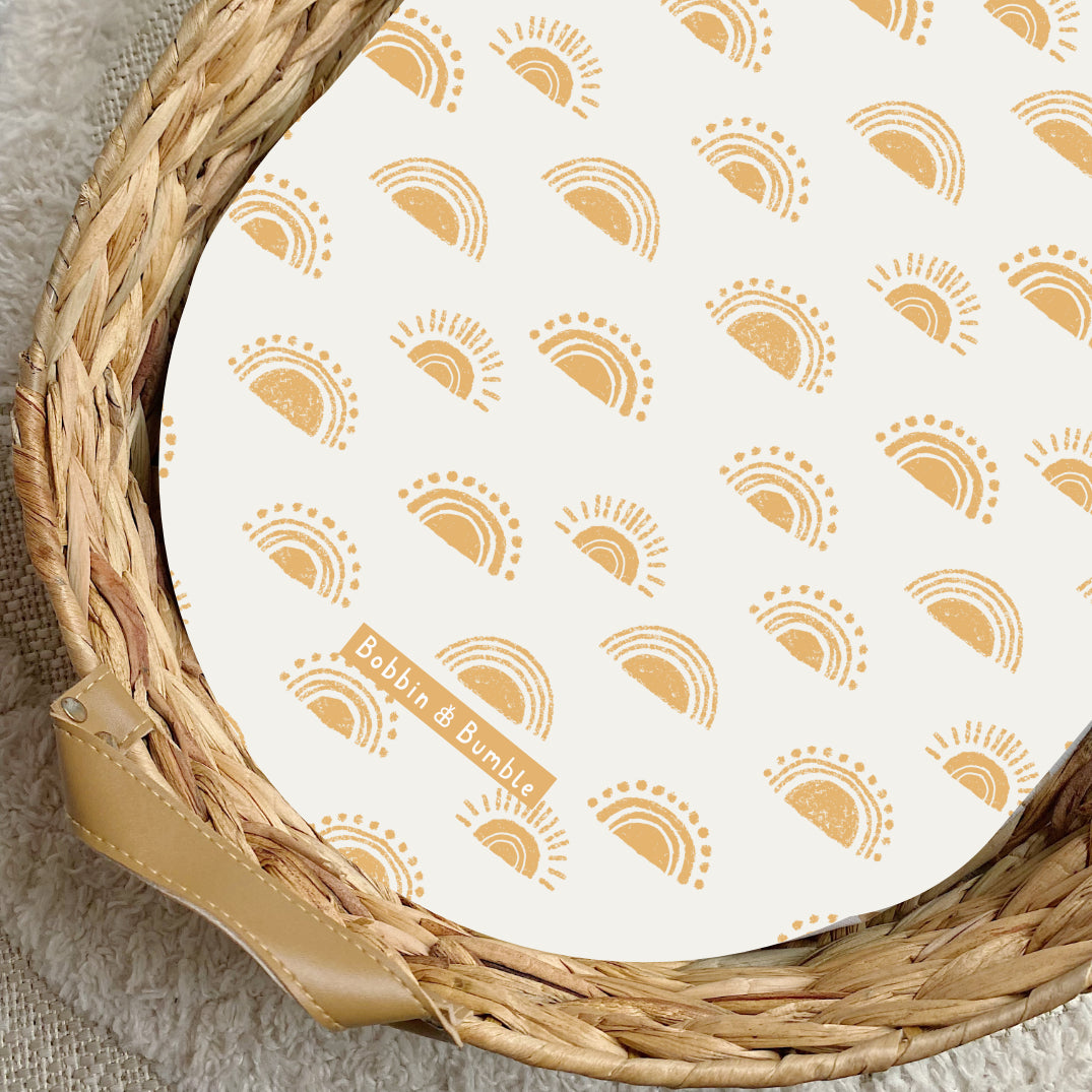 Bring some cosy vibes to your nursery using our Boho Suns PVC Changing Basket Liner. Flaunting a cute sun design in a laid-back boho vibe, this liner boasts a white backdrop with mustard-hued sunsets.