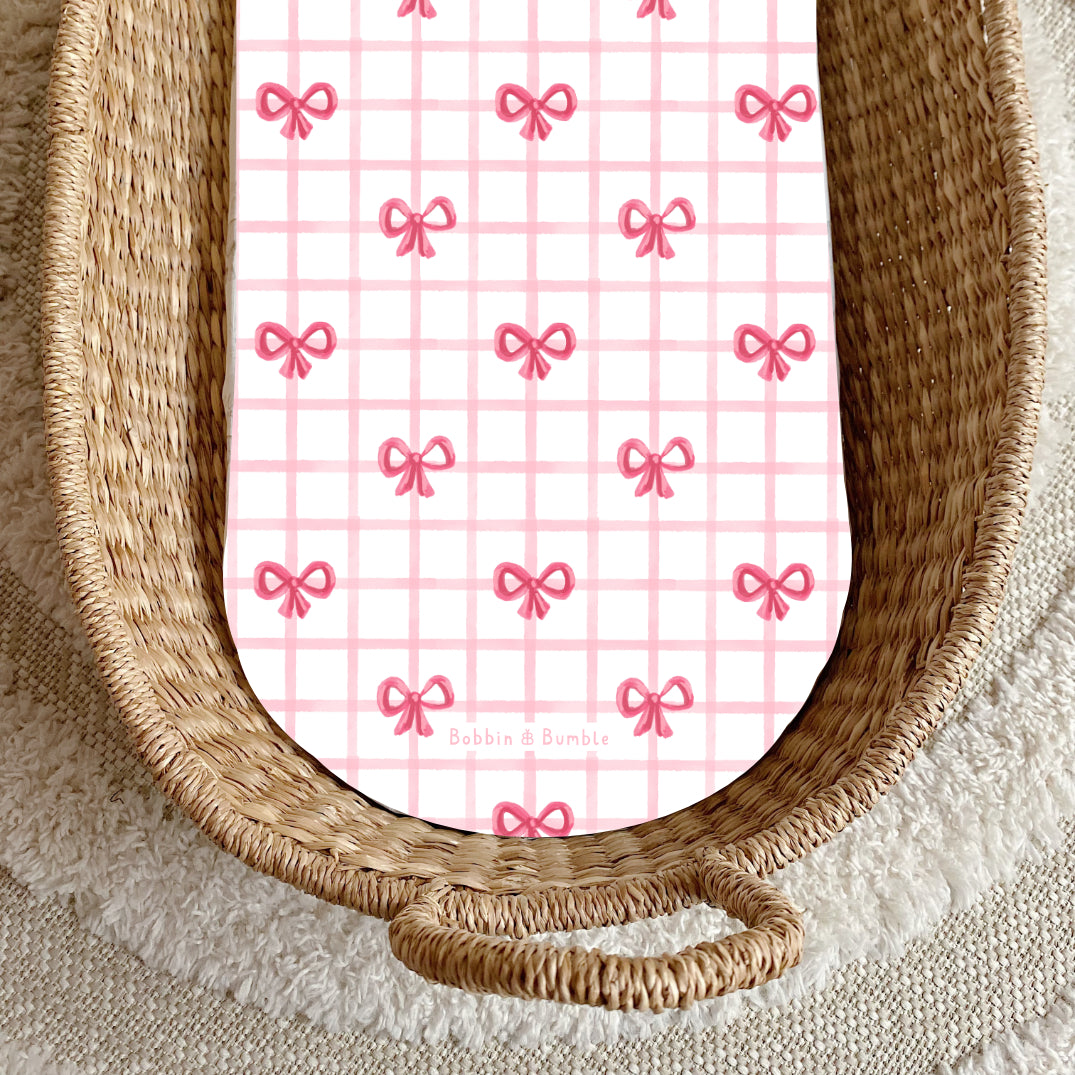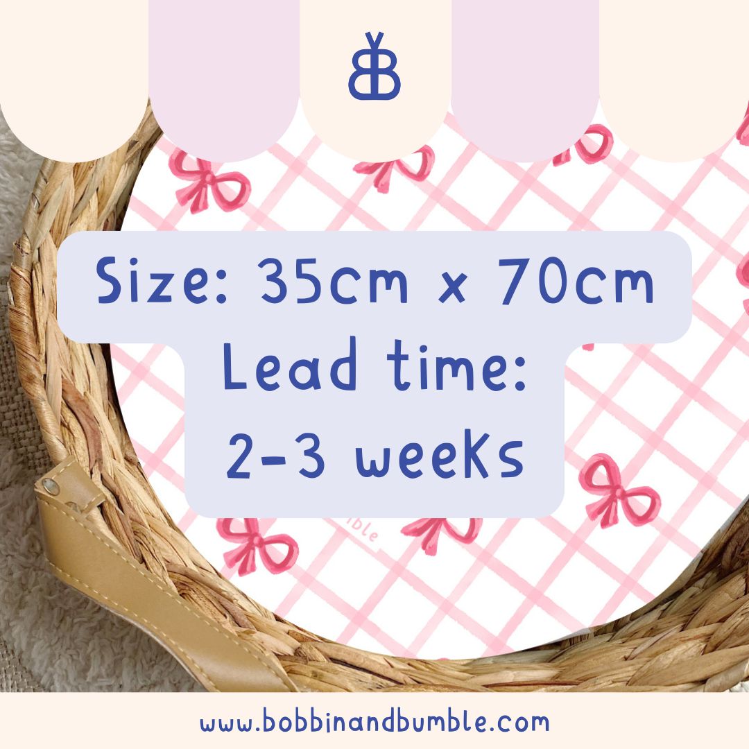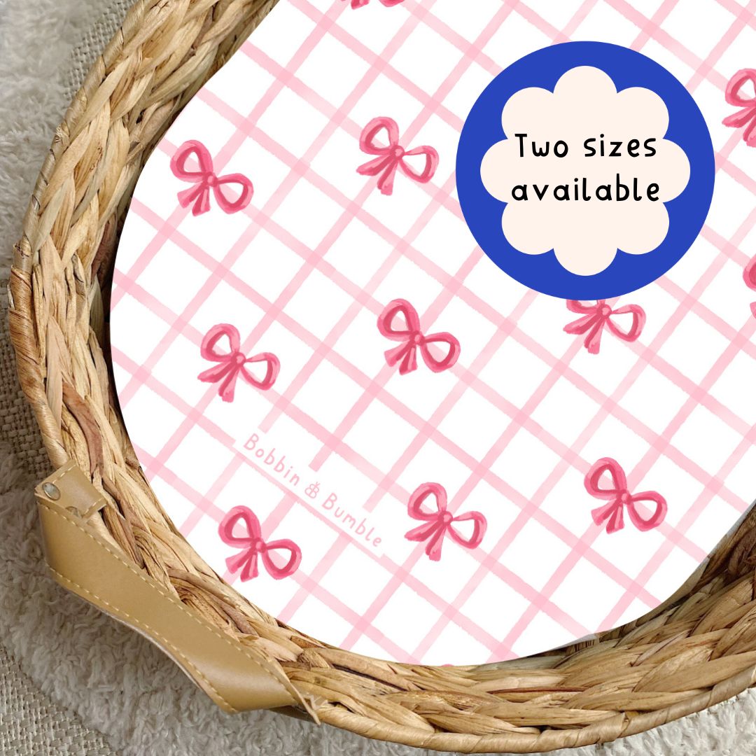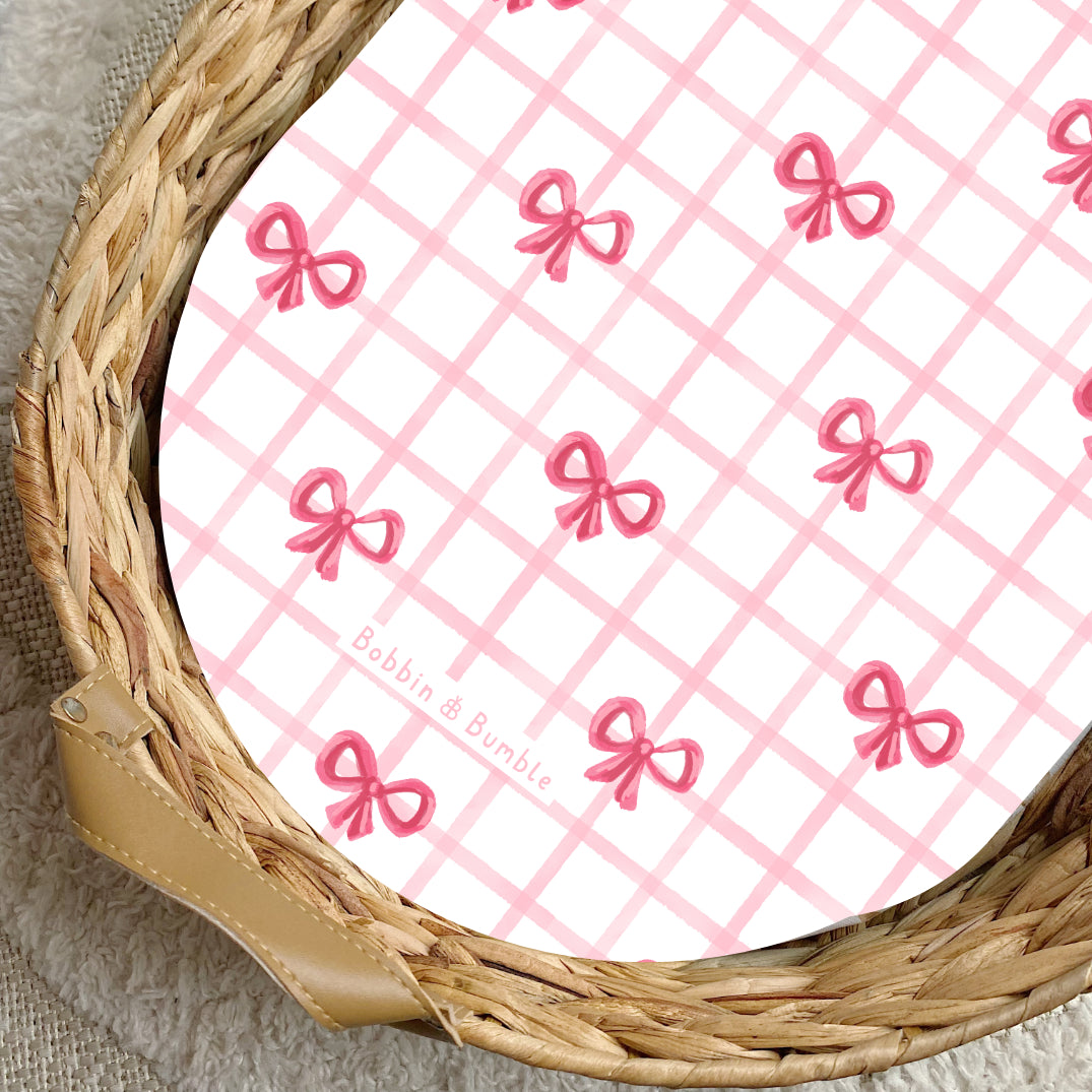Exclusively designed for Bobbin and Bumble, our Pink Gingham Bow basket liner is the perfect finishing touch for a classic, timeless nursery. Featuring a charming pink check background with delicate bows, this liner blends vintage elegance with modern practicality, making nappy changes both stylish and stress-free.
