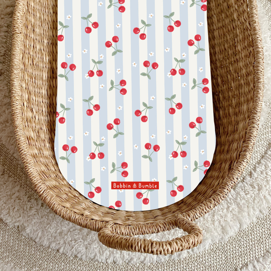 Add a sweet touch of charm to your nursery with our Cherry Stripe Baby Changing Basket Liner. Beautifully handmade in the UK and now available in two sizes.
