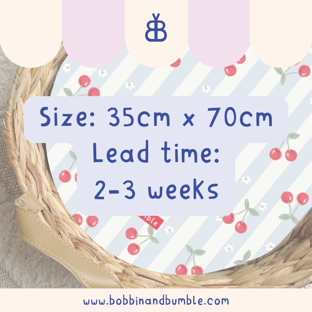 This playful design features fresh red cherries and tiny floral accents on soft blue and white stripes, a perfect mix of vintage whimsy and modern nursery styling. It’s cute, practical, and guaranteed to brighten up every nappy change.