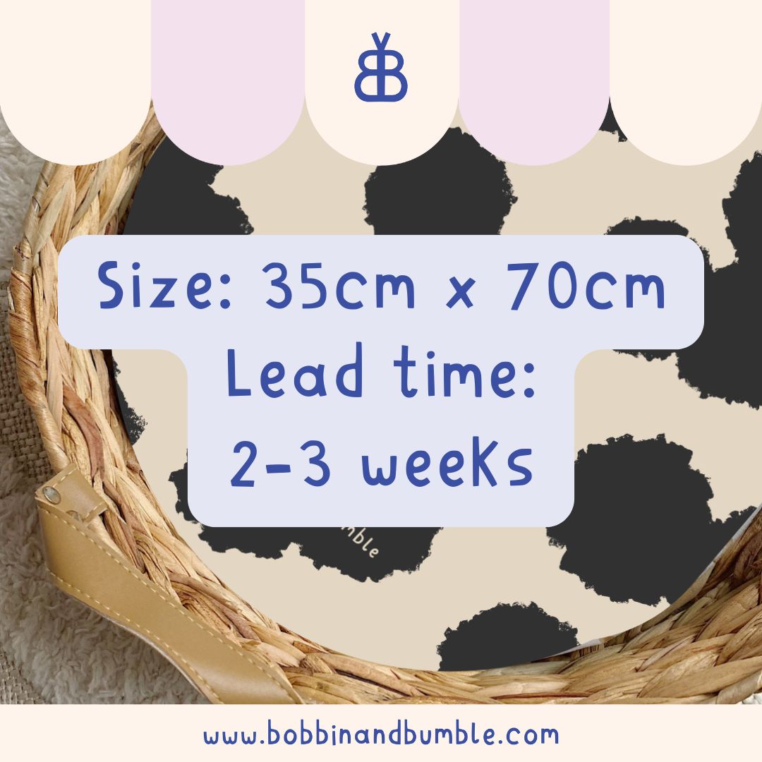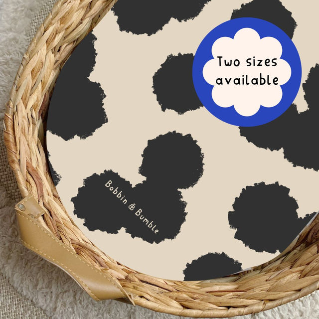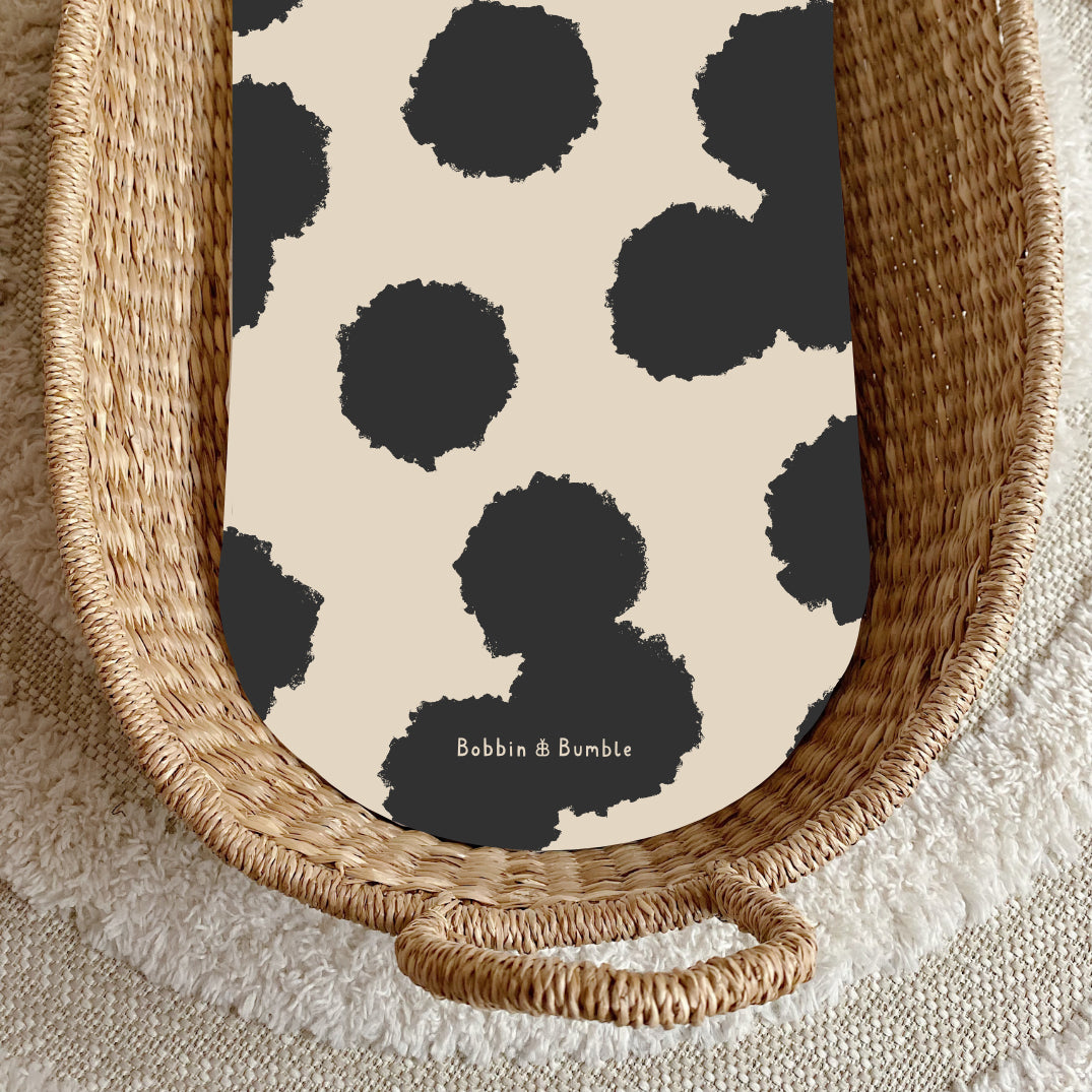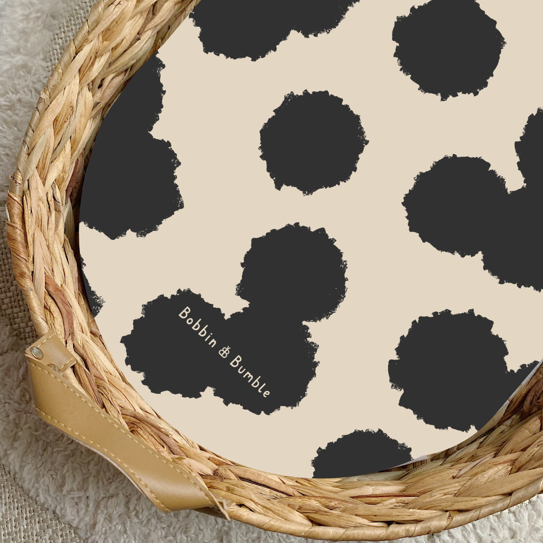 Exclusively designed for Bobbin and Bumble, our Bold Black Spot basket liner is perfect for a modern, minimalist nursery. Featuring chunky, abstract black spots on a warm beige background, this design makes a bold yet timeless statement while keeping nappy changes practical and mess-free.