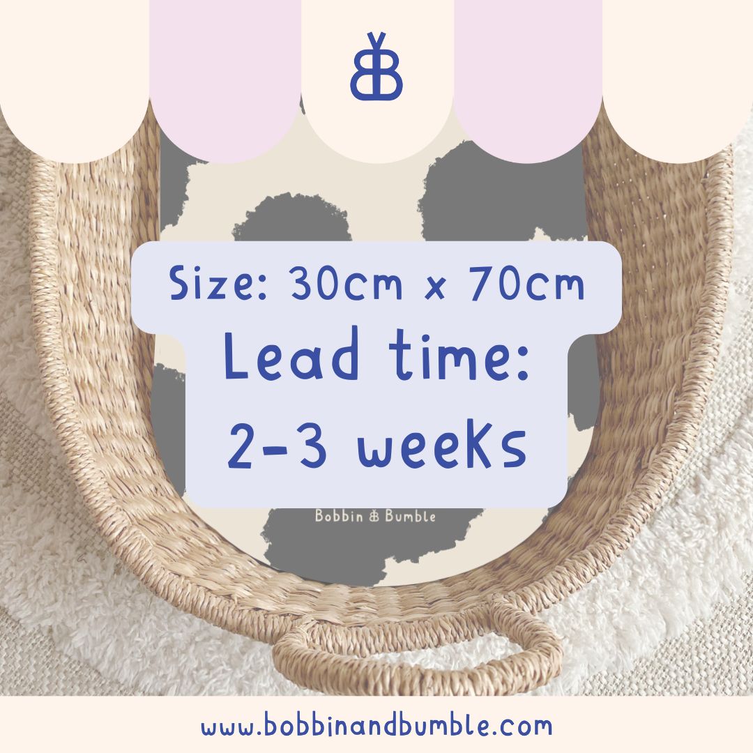 All of our changing basket liners are made to order and generally dispatched within 2 weeks via Evri. Please see our Shipping Page for the most up-to-date information.