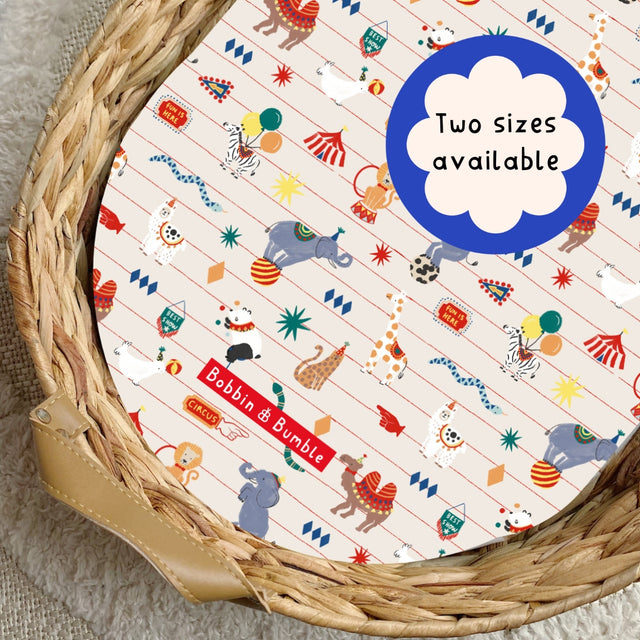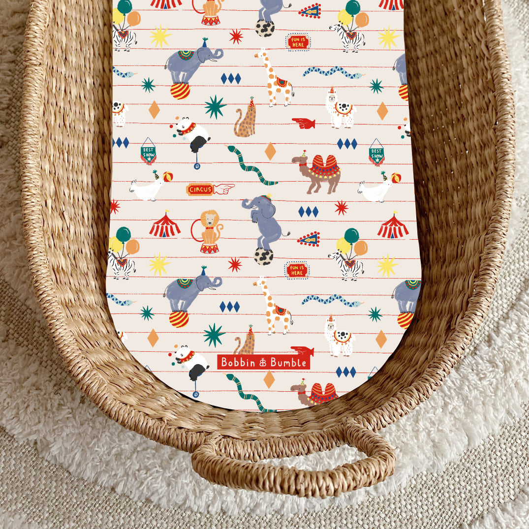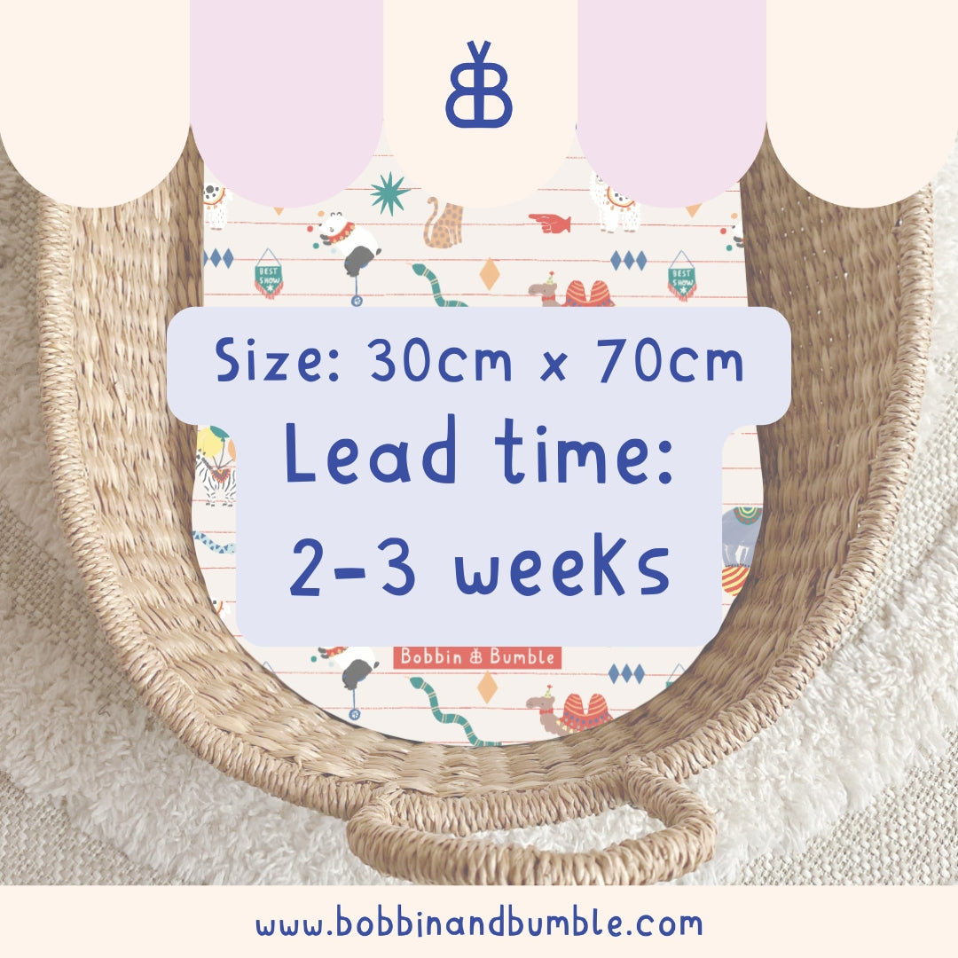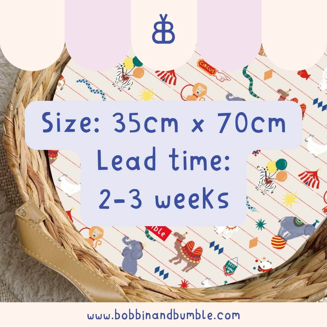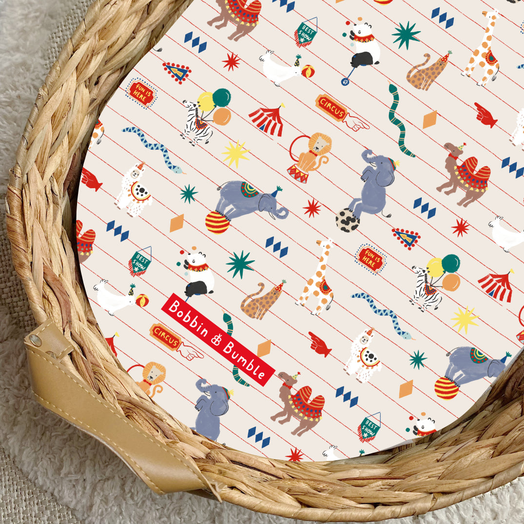 Exclusively designed for Bobbin and Bumble, our Circus Animals Basket Changing Mat Liner brings a playful, imaginative feel to your changing area. Featuring a lively parade of elephants, alpacas, zebras, and even snakes performing circus tricks, this unique print is perfect for a modern, unisex nursery. Bold, fun, and completely original, this design makes nappy changes just a little more joyful.