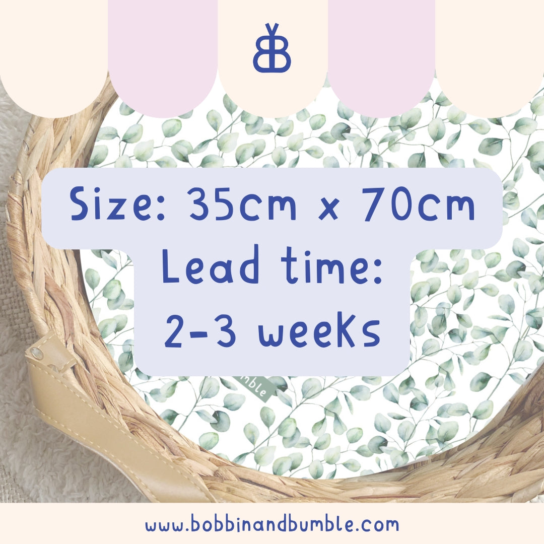 Eucalyptus PVC Changing Basket Liner | Bobbin and Bumble - 30cm x 70cm (Fits Olli Ella) is backordered and will ship as soon as it is back in stock.
