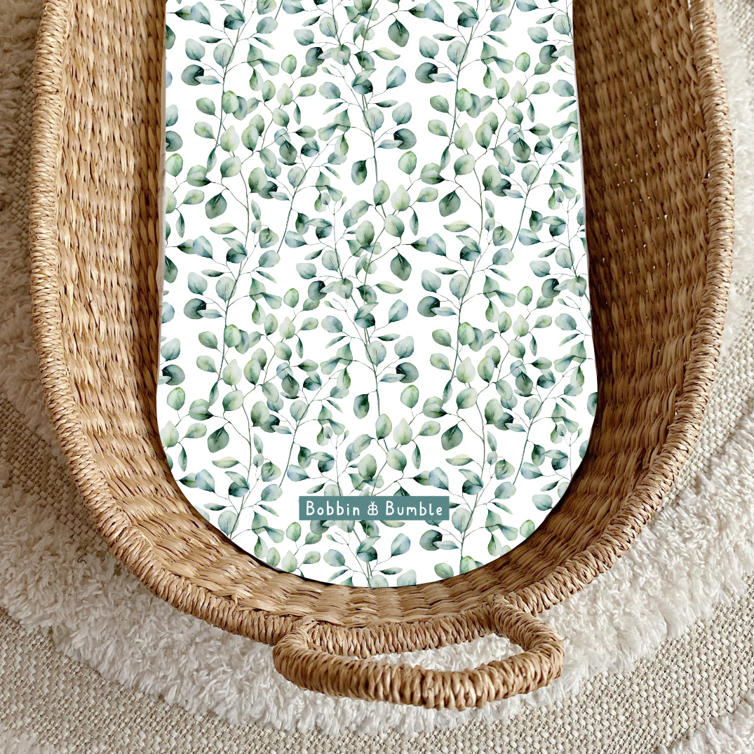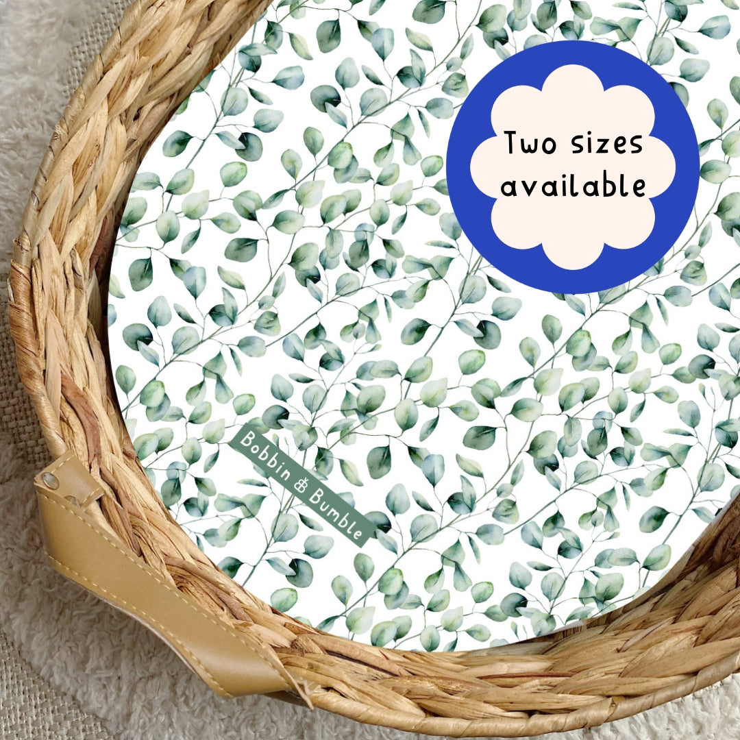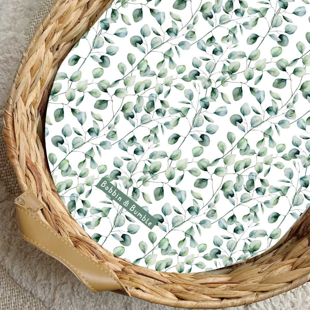 Bring a fresh, natural feel to your nursery with our Eucalyptus PVC Changing Basket Liner. Featuring a soothing eucalyptus leaf pattern on a white background.
