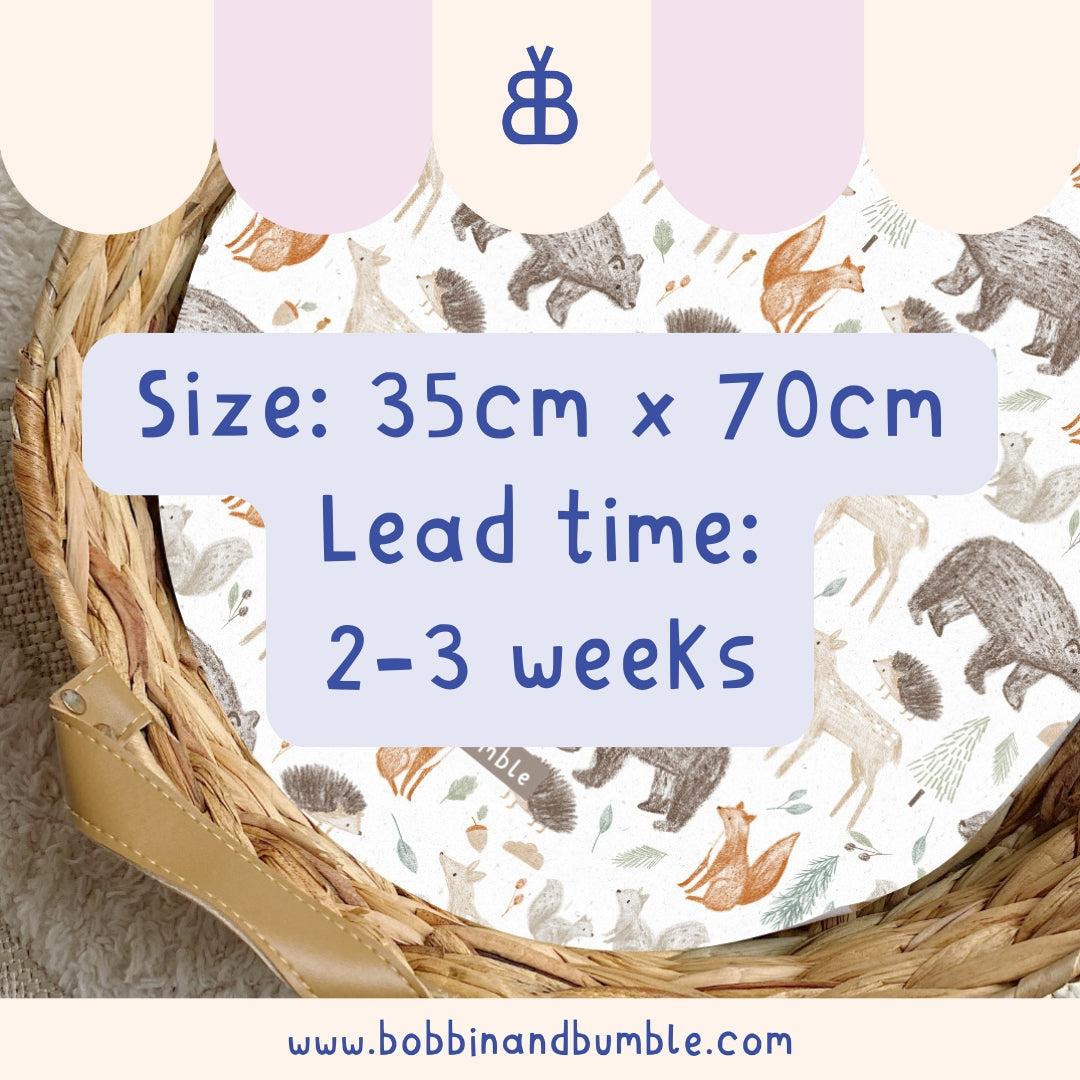 Forest Friends PVC Changing Basket Liner | Bobbin and Bumble - 30cm x 70cm (Fits Olli Ella Nyla) is backordered and will ship as soon as it is back in stock.