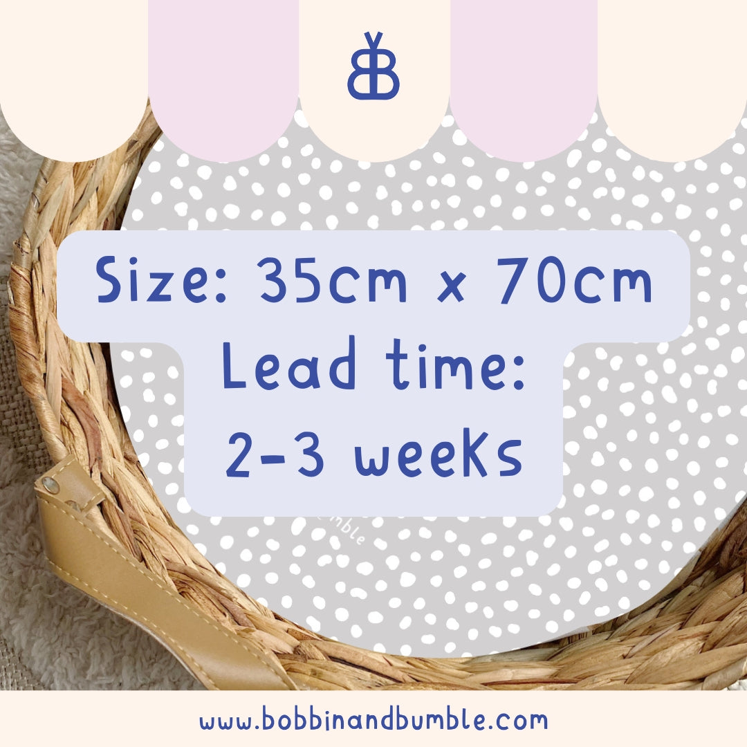 All of our changing basket liners are made to order and generally dispatched within 2 weeks via Evri. Please see our Shipping Page for the most up-to-date information.
