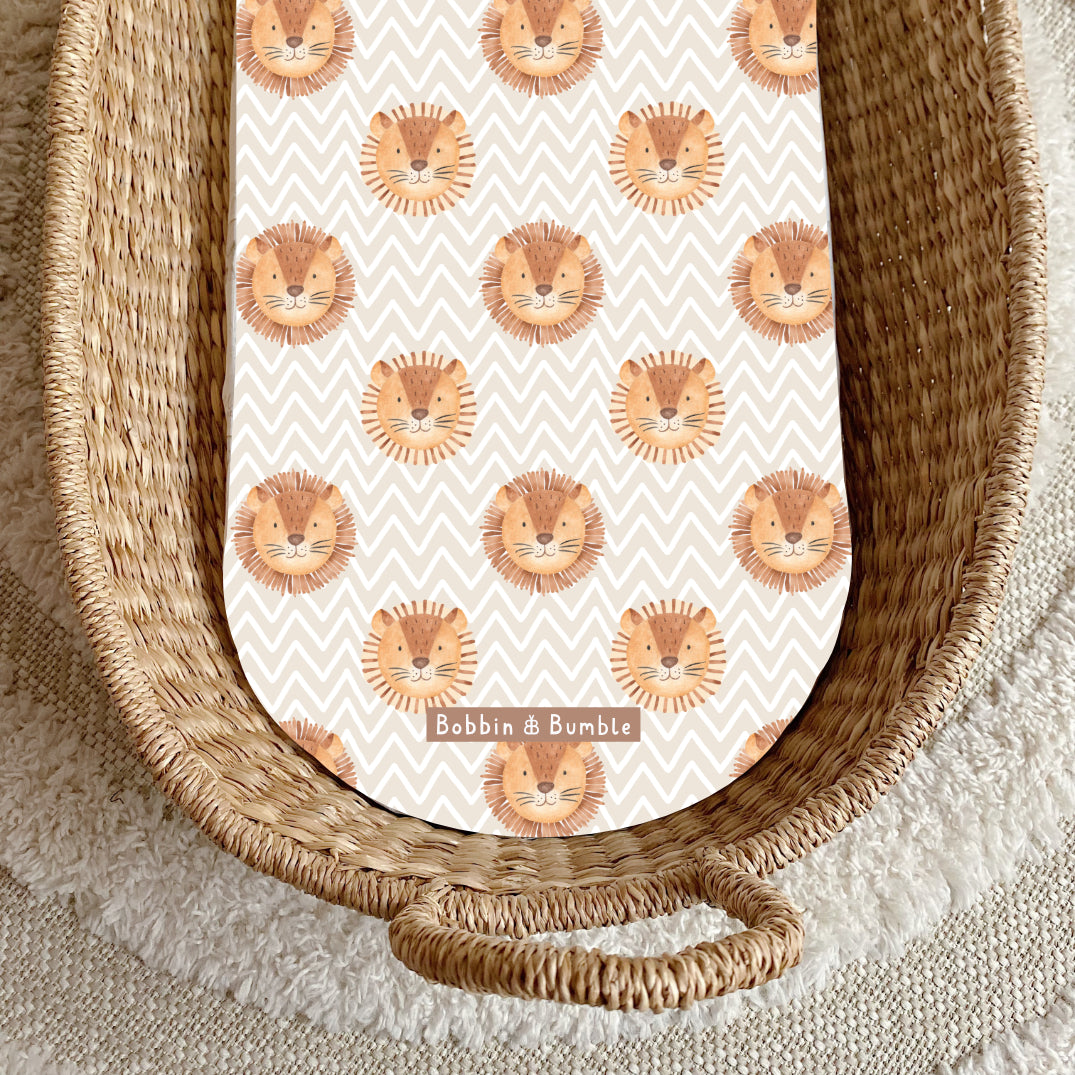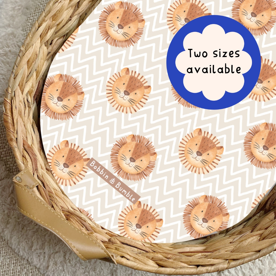 Bring a playful safari vibe to your nursery with our Leo Lion Head PVC Changing Basket Liner. Featuring an adorable lion head design on a beige chevron background.