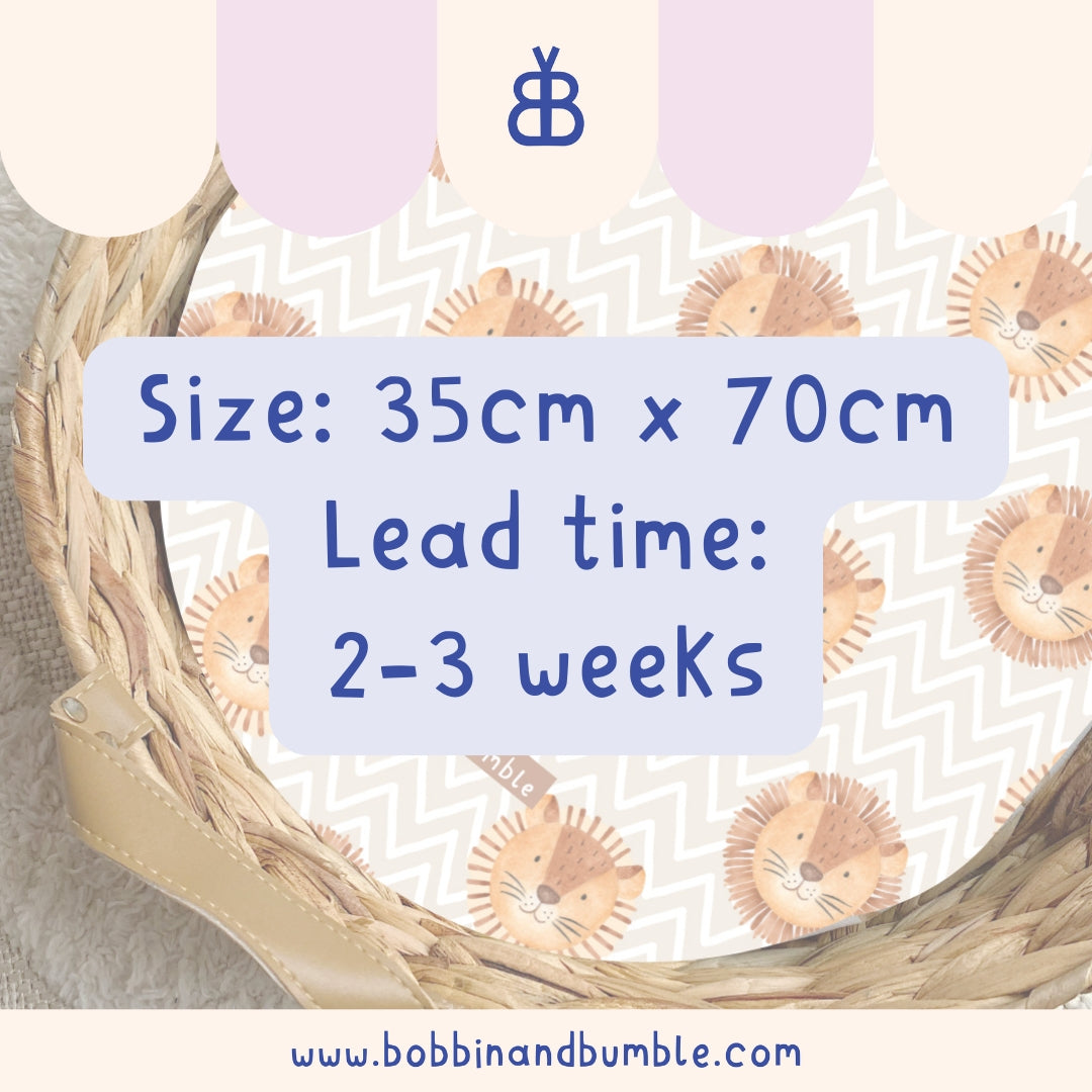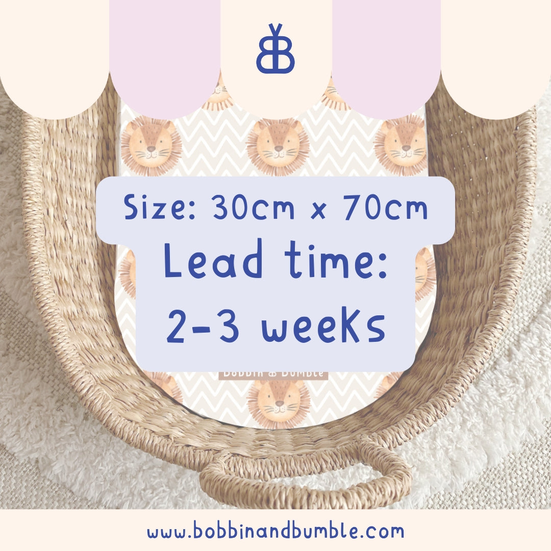 All of our changing basket liners are made to order and generally dispatched within 2 weeks via Evri. Please see our Shipping Page for the most up-to-date information.