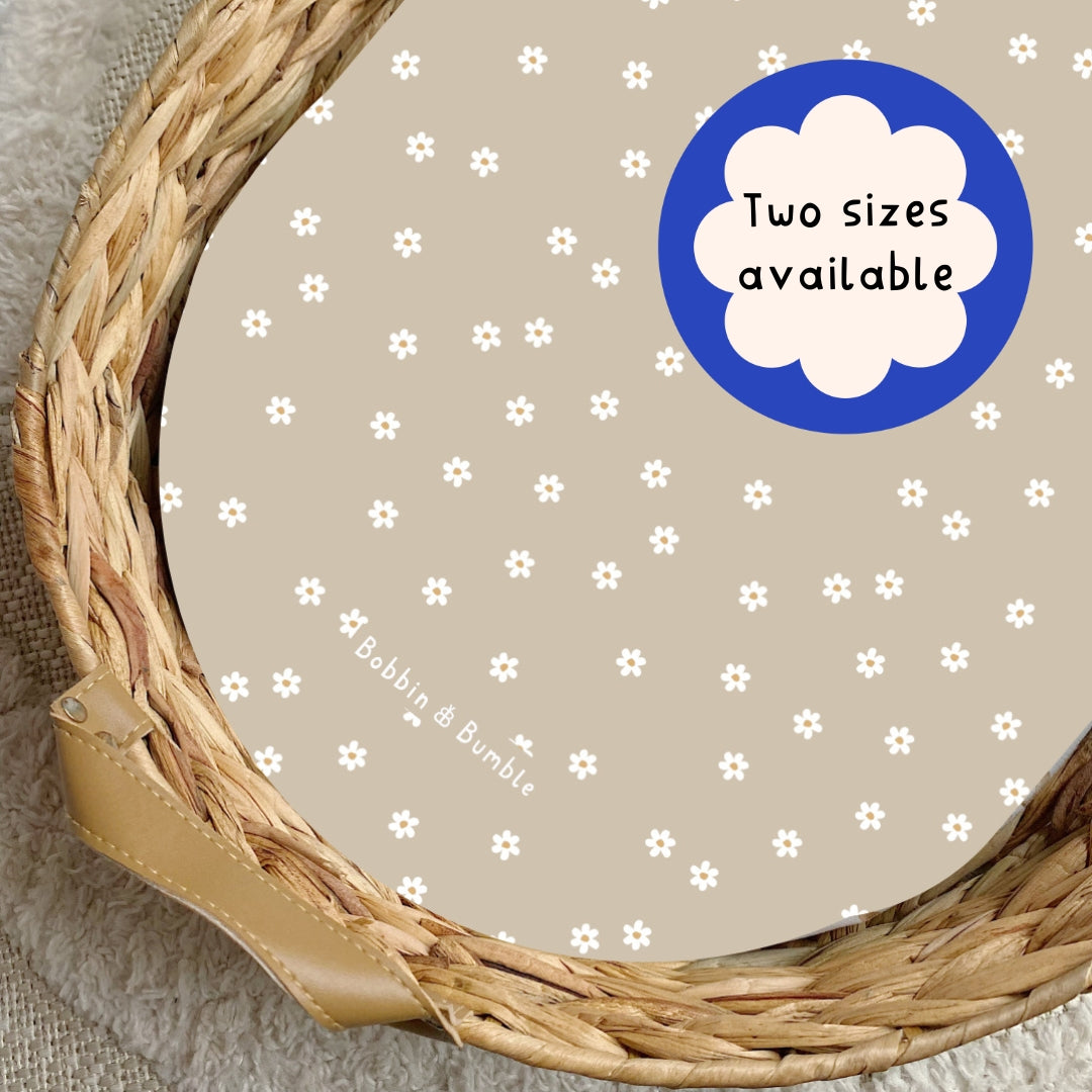 Add a touch of natural charm to your nursery with our Neutral Daisy PVC Changing Basket Liner. Featuring a simple and elegant white daisy pattern on a soft neutral background.