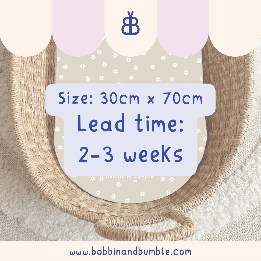 All of our changing basket liners are made to order and generally dispatched within 2 weeks via Evri. Please see our Shipping Page for the most up-to-date information.