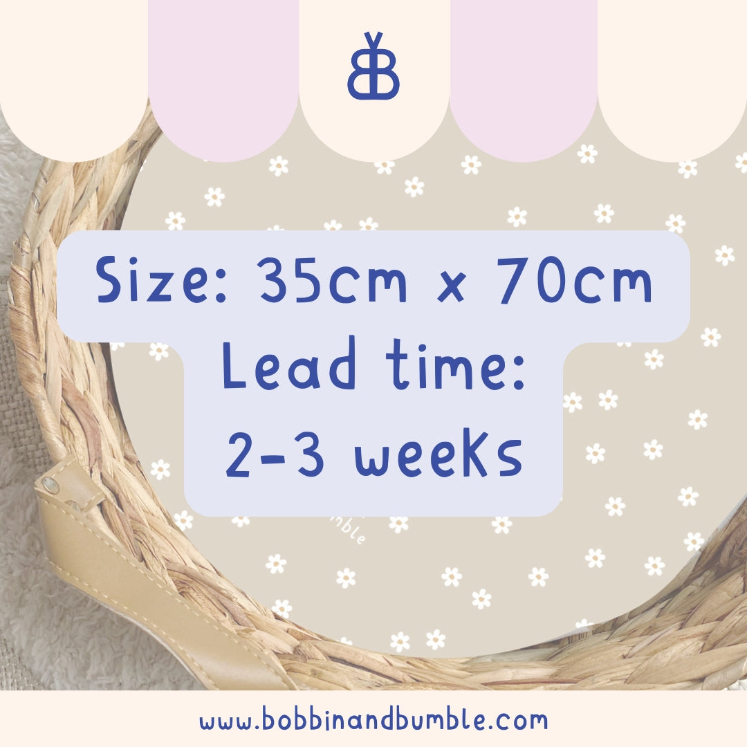 Neutral Daisy PVC Changing Basket Liner | Bobbin and Bumble - 30cm x 70cm (Fits Olli Ella) is backordered and will ship as soon as it is back in stock.