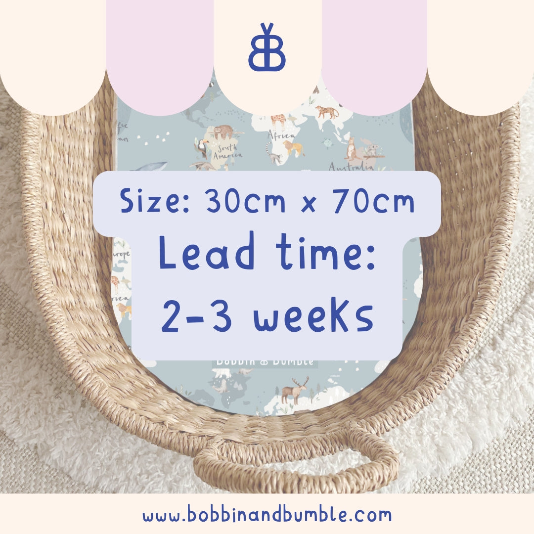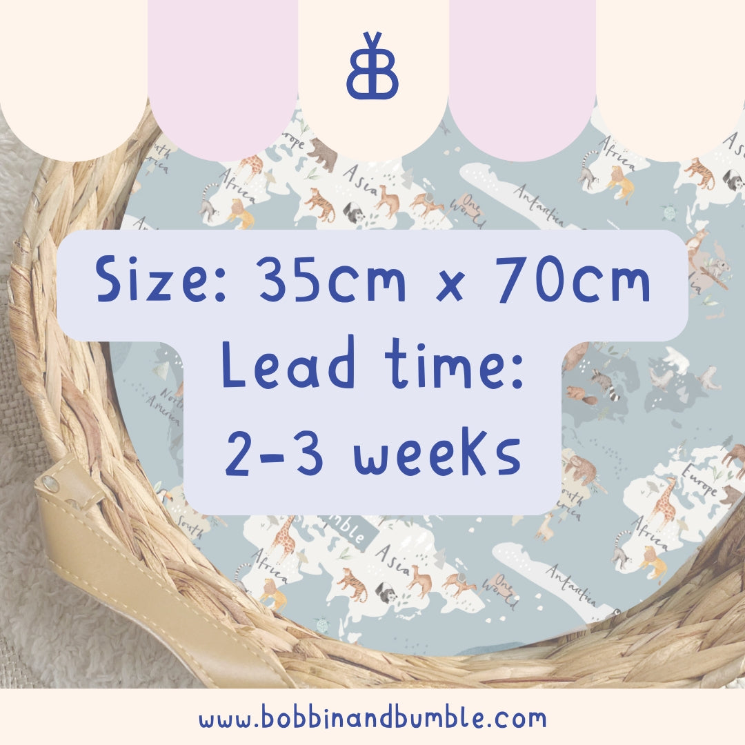 All of our changing basket liners are made to order and generally dispatched within 2 weeks via Evri. Please see our Shipping Page for the most up-to-date information.