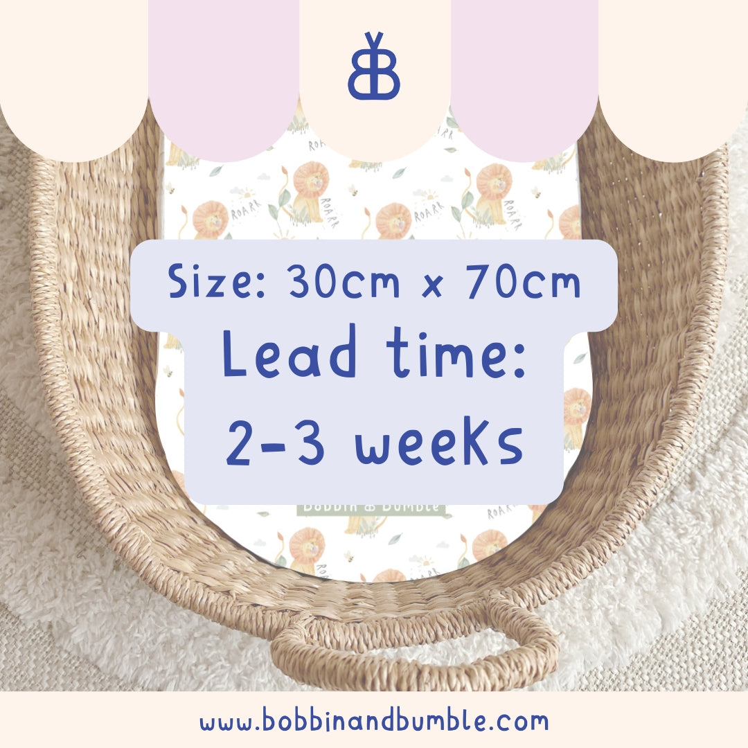 All of our changing basket liners are made to order and generally dispatched within 2 weeks via Evri. Please see our Shipping Page for the most up-to-date information.
