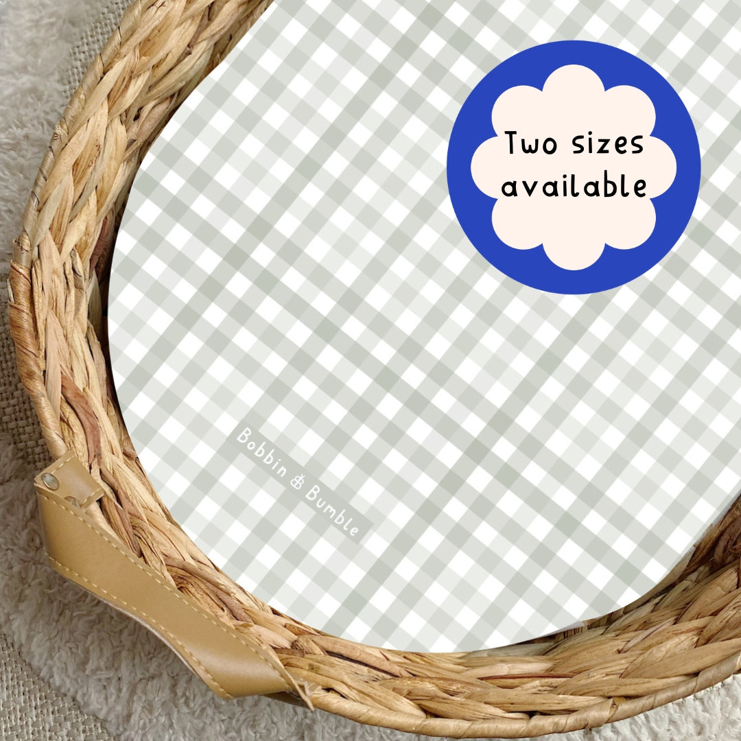 Our Sage Gingham PVC Changing Basket Liner combines a classic look with modern practicality. Featuring a soft sage gingham pattern on a white background.