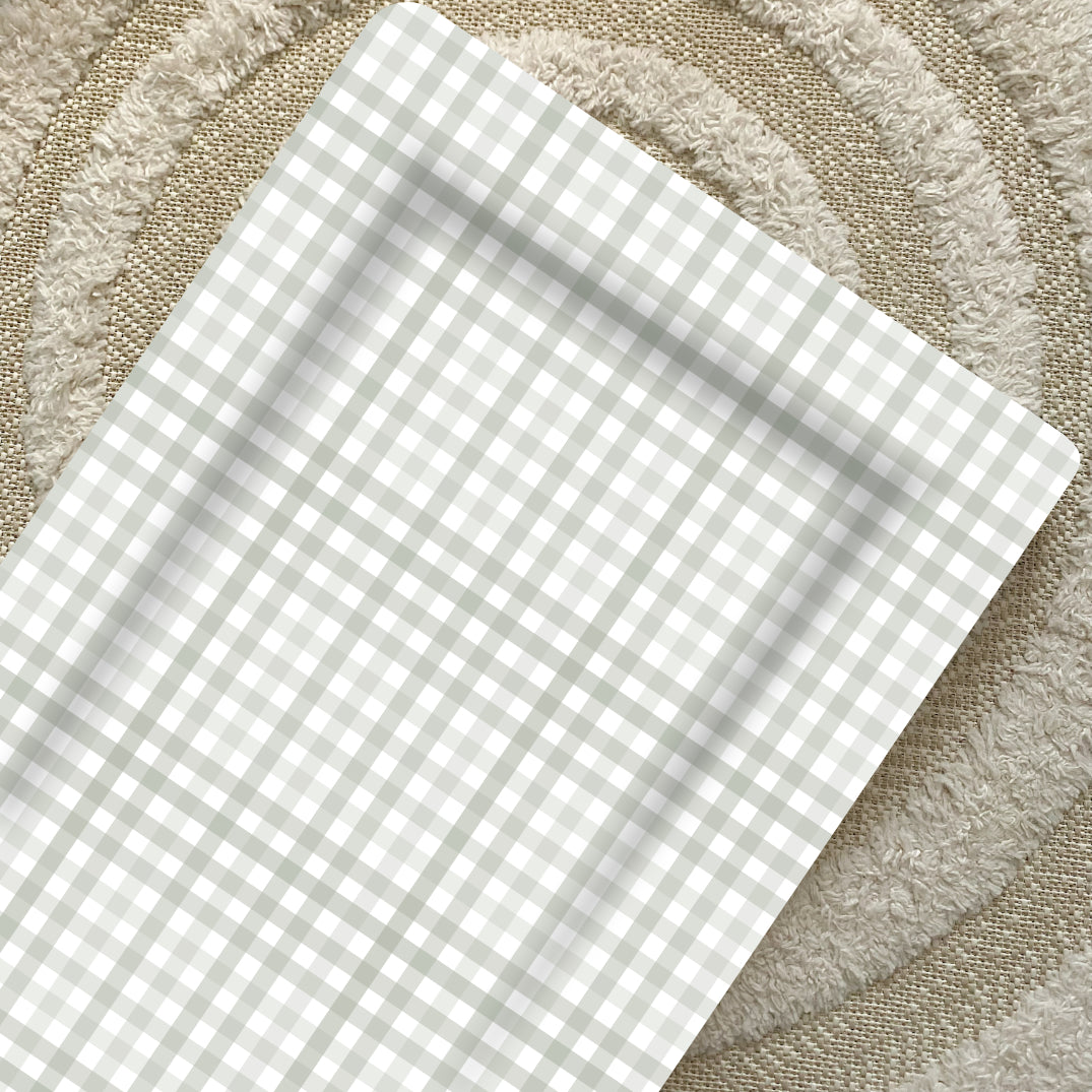 A traditional baby changing mat in a sage green gingham print. If you love this classic Gingham design we also have it available in our Wedge Changing Mat and our Changing Basket Liners.