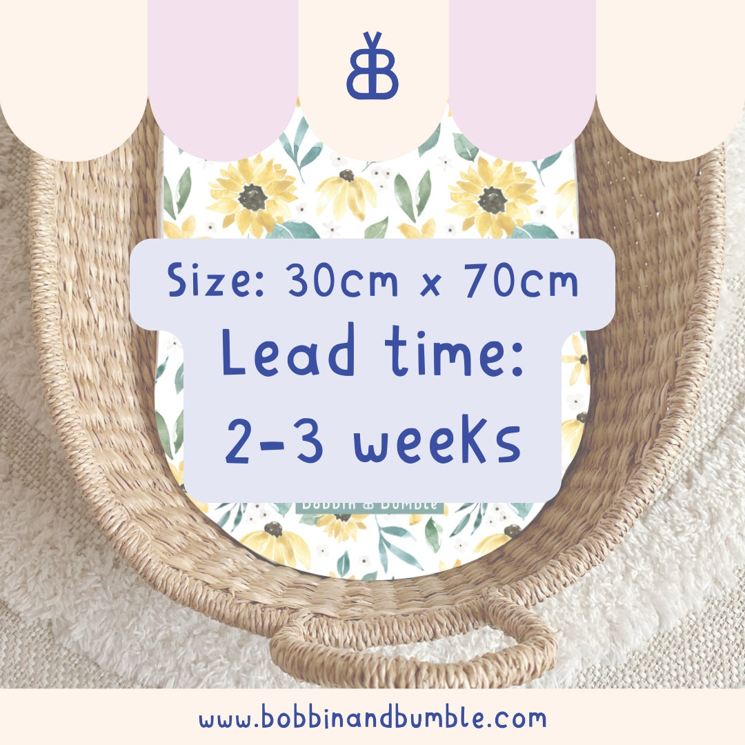 All of our changing basket liners are made to order and generally dispatched within 2 weeks via Evri. Please see our Shipping Page for the most up-to-date information.