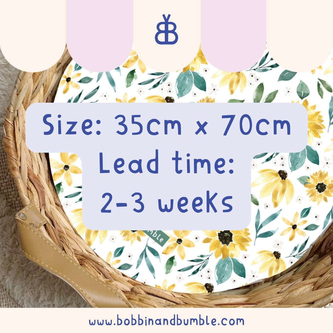 Sunflowers PVC Changing Basket Liner | Bobbin and Bumble - 30cm x 70cm (Fits Olli Ella Nyla) is backordered and will ship as soon as it is back in stock.