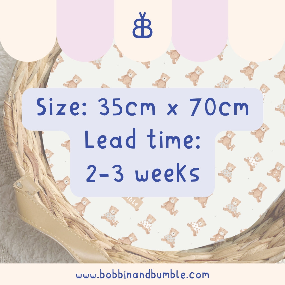 Teddy Bears PVC Changing Basket Liner | Bobbin and Bumble - 30cm x 70cm (Fits Olli Ella Nyla) is backordered and will ship as soon as it is back in stock.