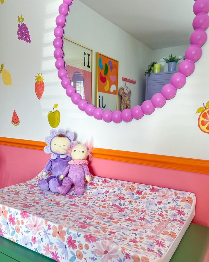 A spin on a classic pink changing mat, our magenta floral is a striking bold print covered in flowers. It is the perfect choice for a baby girl's nursery. Pink, purple, and orange make up this beautiful floral design.
