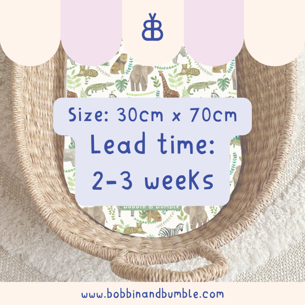 All of our changing basket liners are made to order and generally dispatched within 2 weeks via Evri. Please see our Shipping Page for the most up-to-date information.