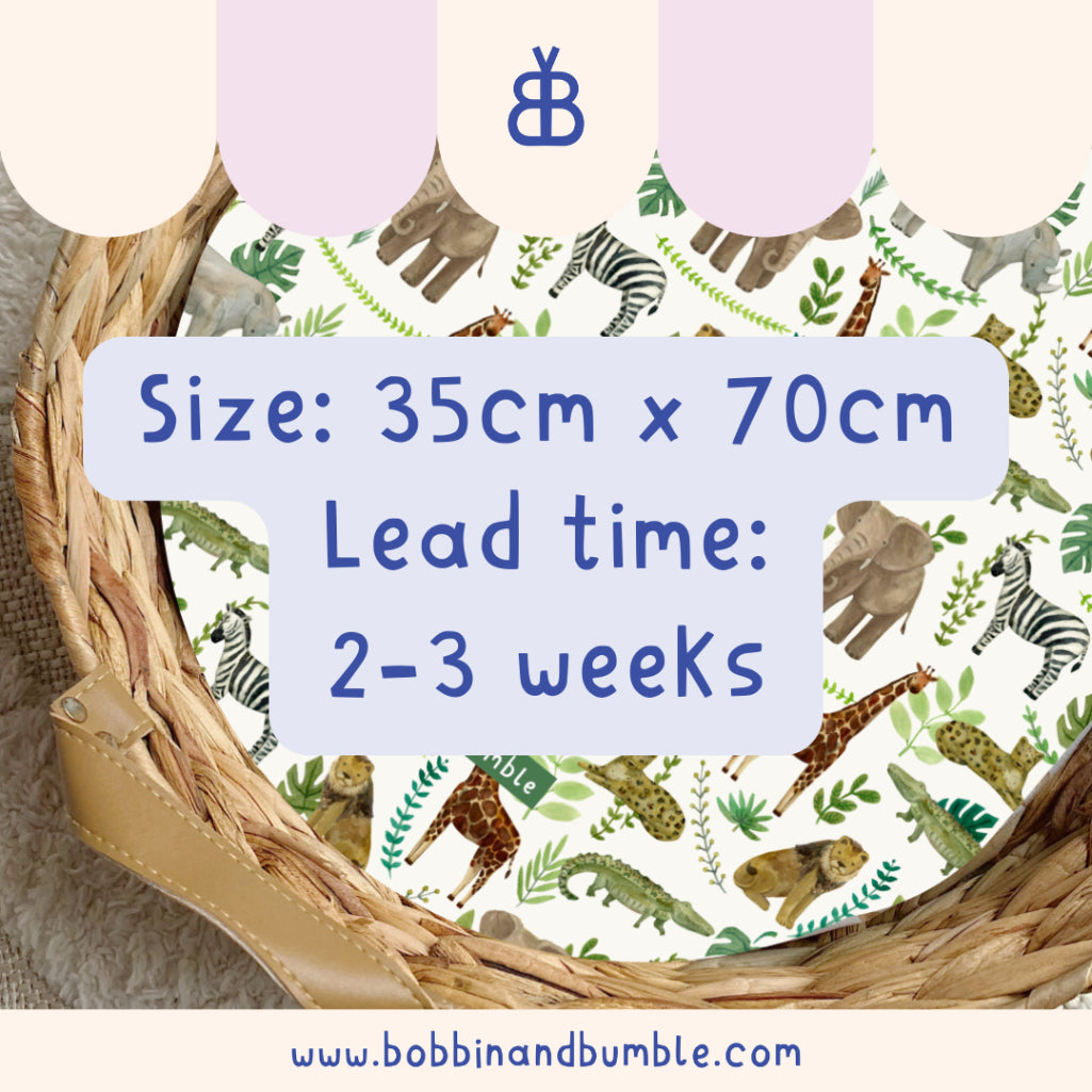 Safari Animals PVC Changing Basket Liner | Bobbin and Bumble - 30cm x 70cm (Fits Olli Ella) is backordered and will ship as soon as it is back in stock.